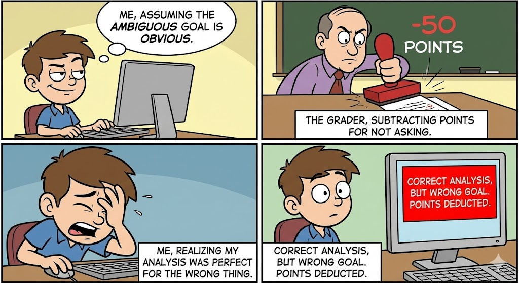 Failing to ask clarifying questions when the goal is ambiguous directly subtracts points, even if the later analysis is correct.