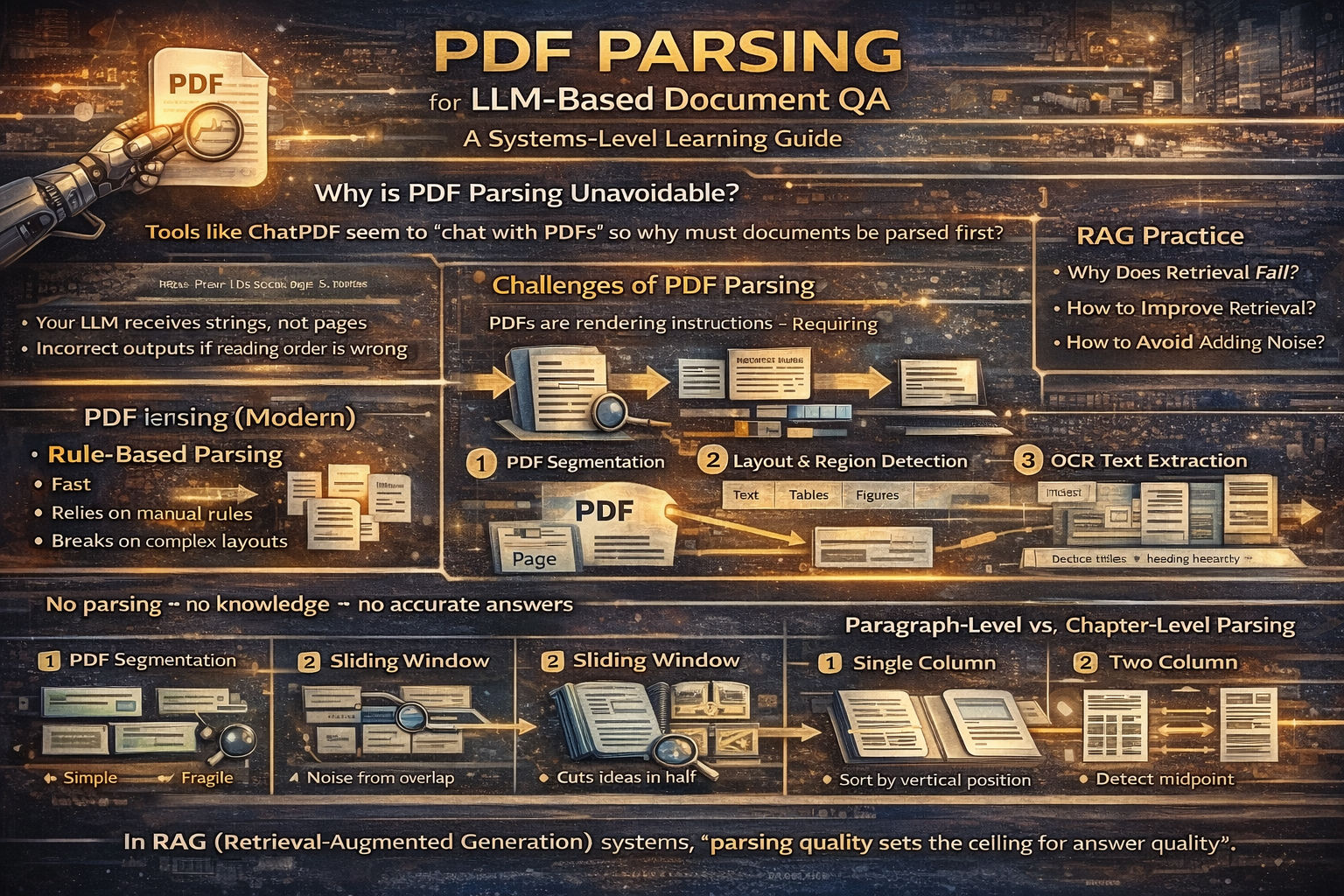 The guide covers PDF parsing challenges for LLM-based document question answering, including why parsing is foundational, PDFs as rendering instructions, layout detection and reading-order reconstruction, OCR and text extraction, table and figure handling, and trade-offs between rule-based and AI-based parsing pipelines.